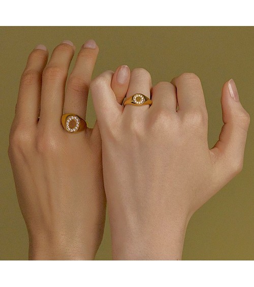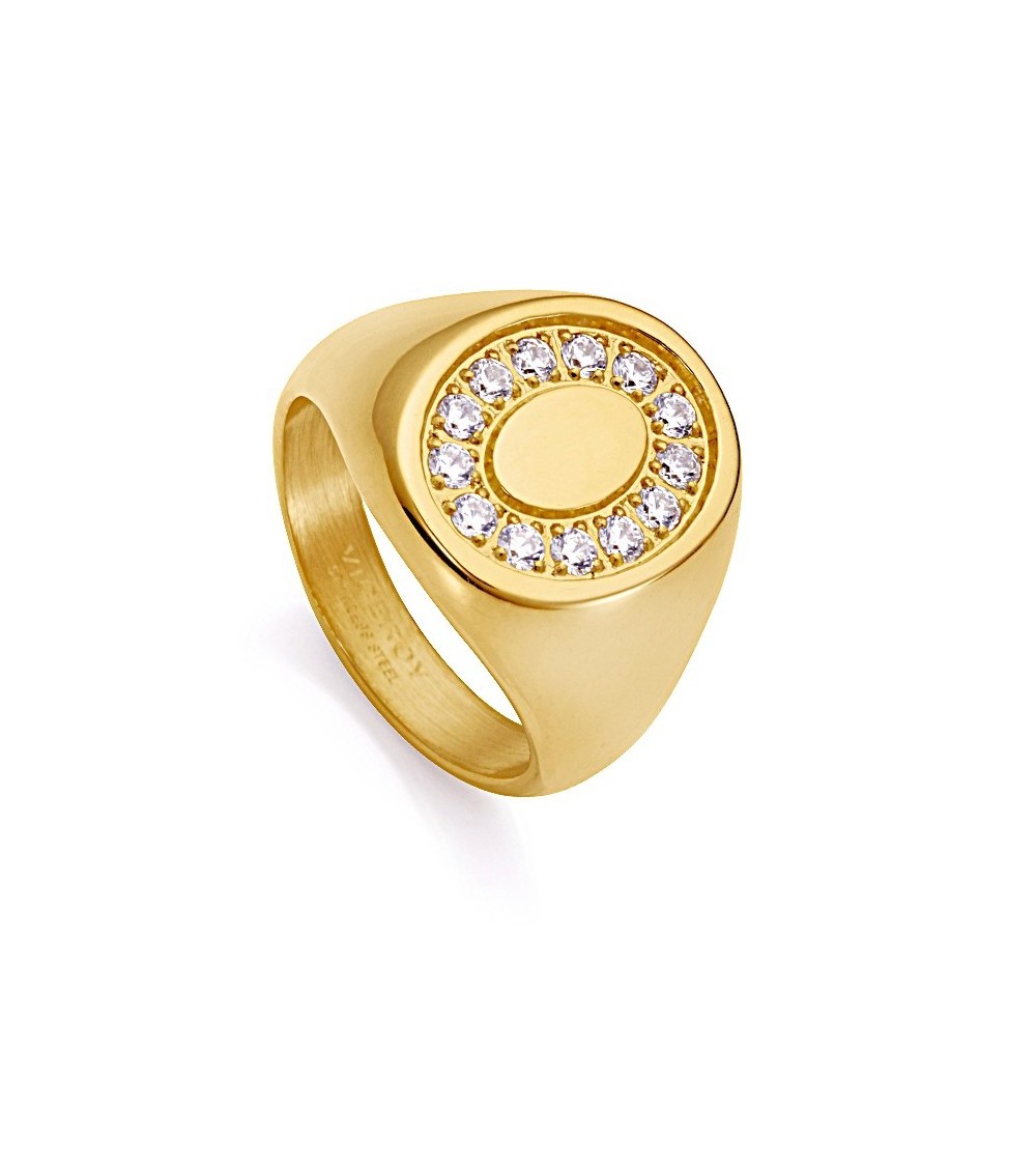 ANILLO ACERO DORADO MODELO SELLO OVALADO ORLA DE CIRCONITAS
