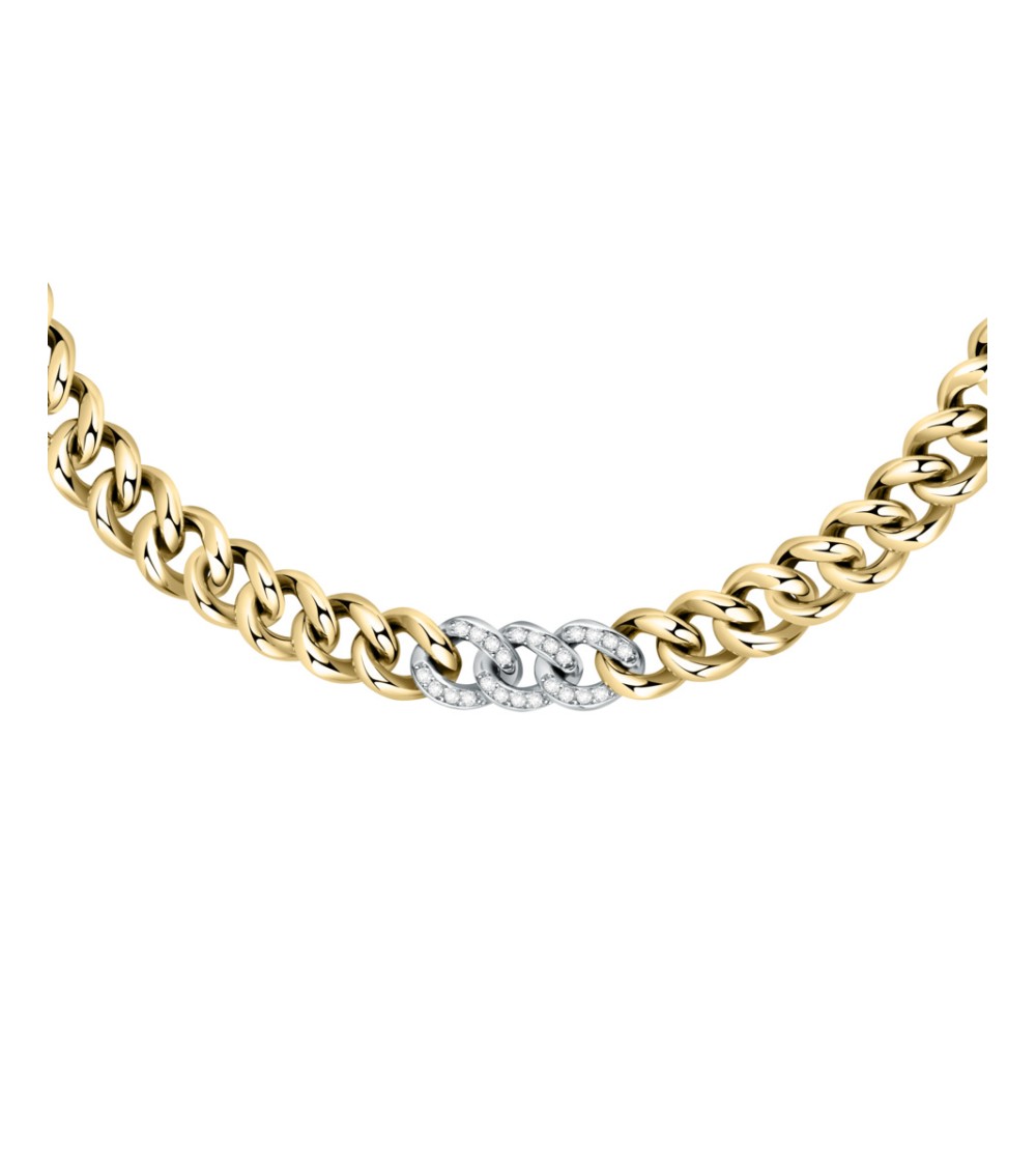 GARGANTILLA DORADA ESLABONES ANCHOS Y CENTRO ACERO PLATEADO CON CIRCONITAS