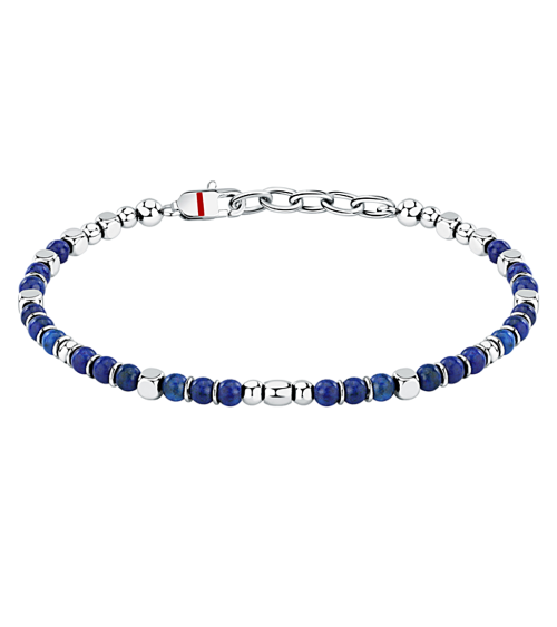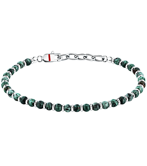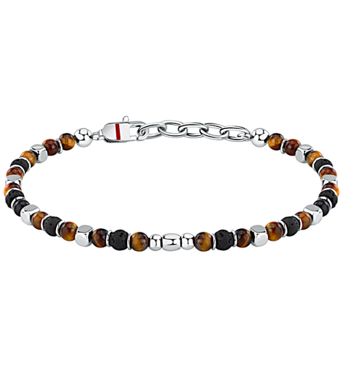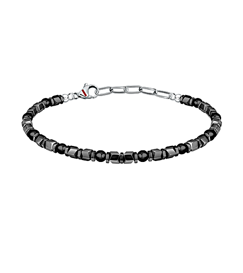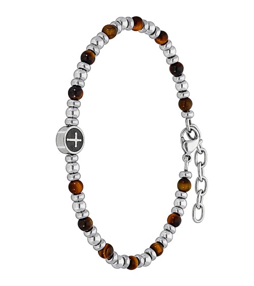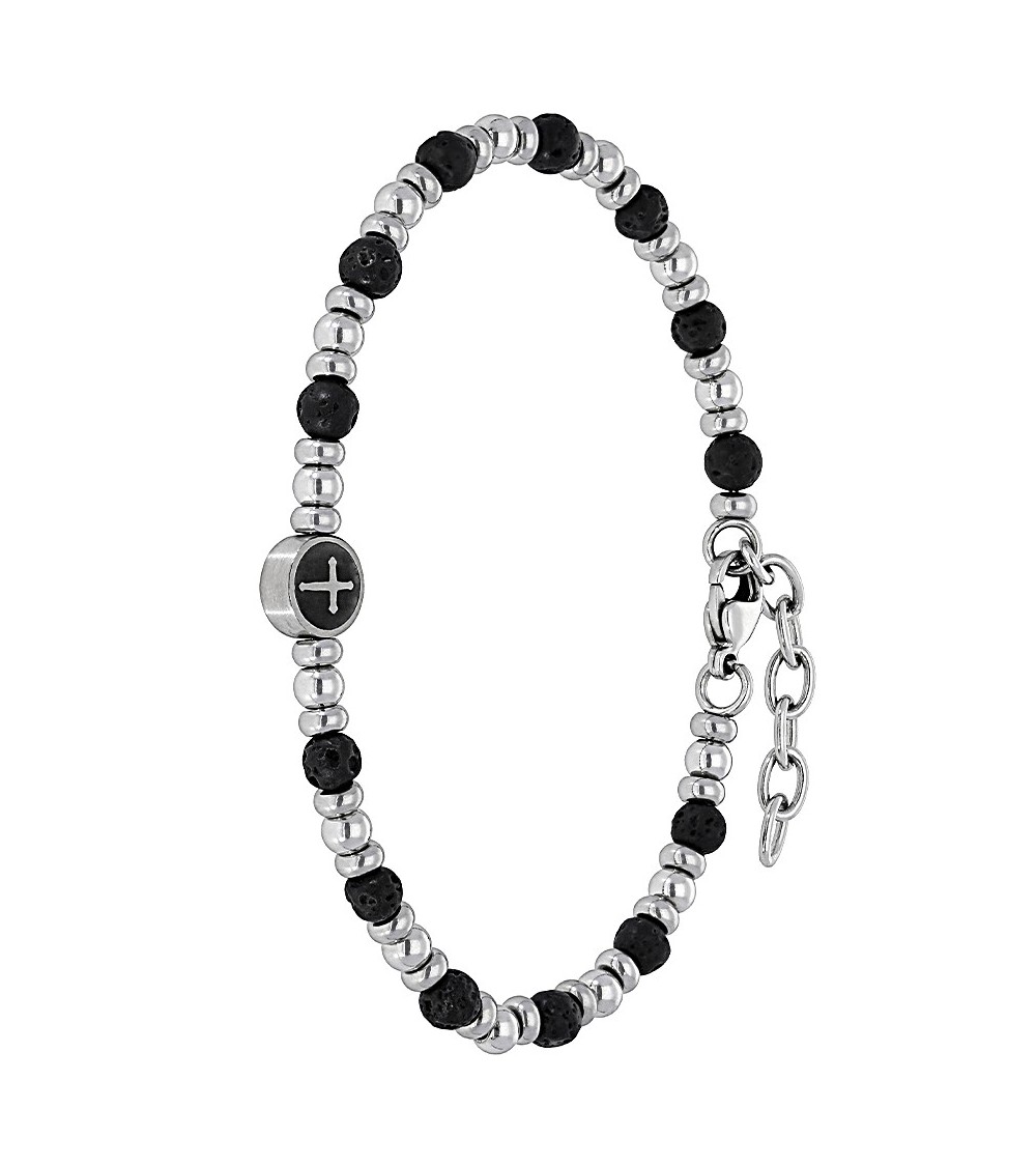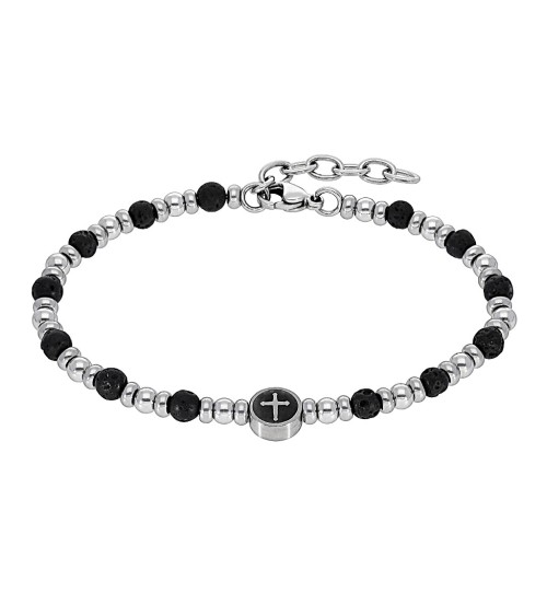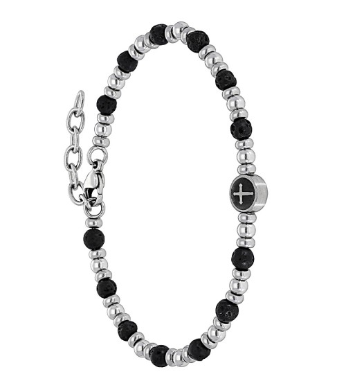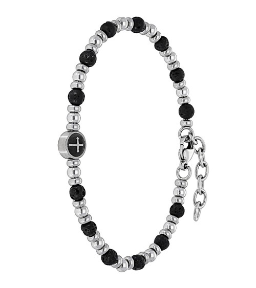 PULSERA DE HOMBRE BOLAS DE ACERO Y VOLCÁNICA NEGRA CON CHAPA Y CRUZ