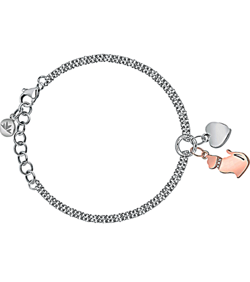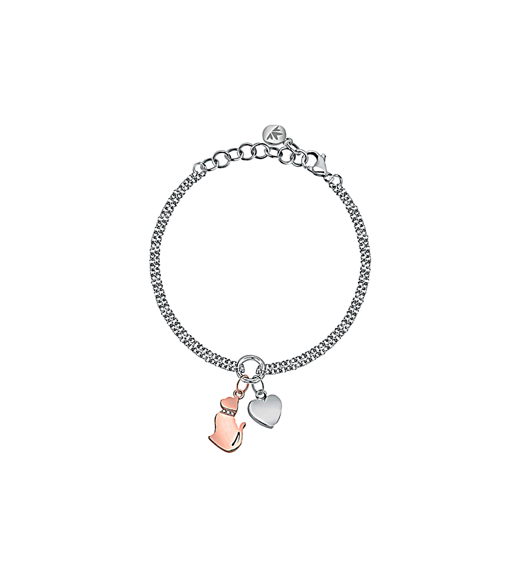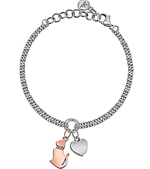 PULSERA ACERO CON ABALORIO COLGANDO CORAZÓN Y GATO.
