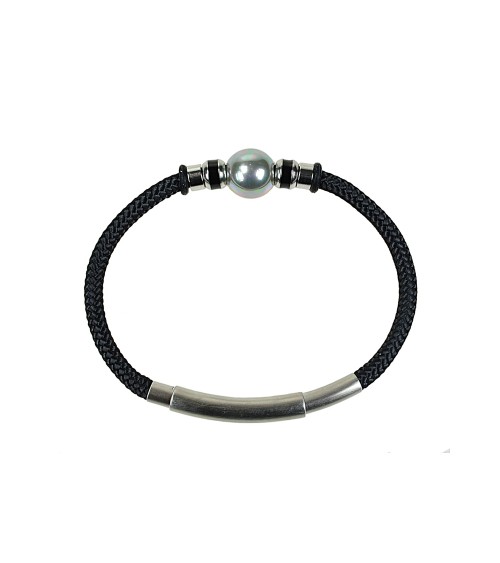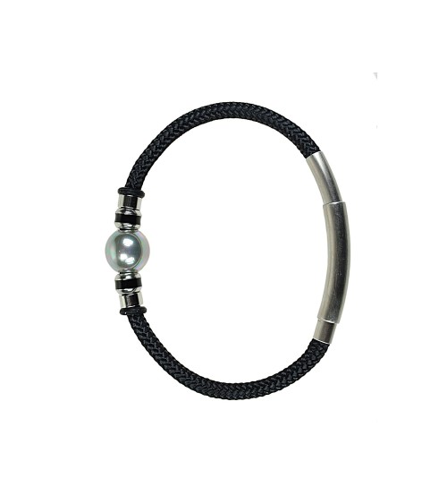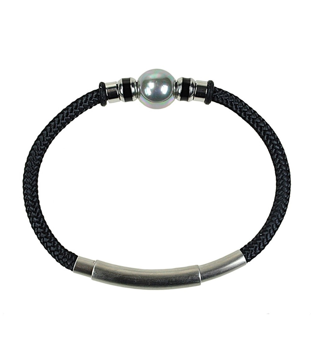 PULSERA NÁUTICA ACERO CORDÓN NEGRO CON PERLA GRIS