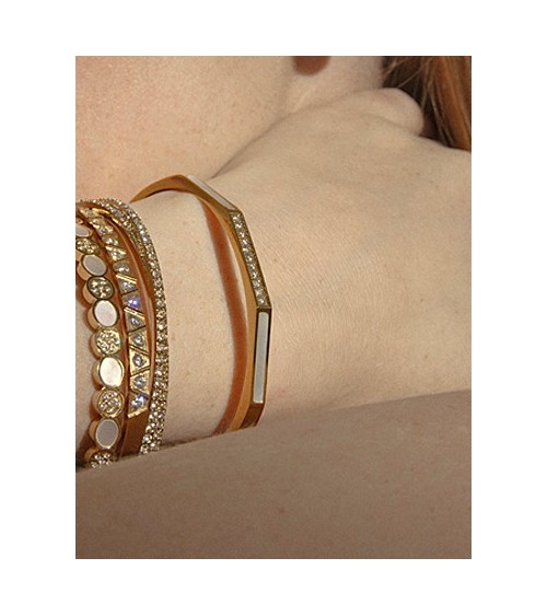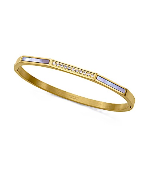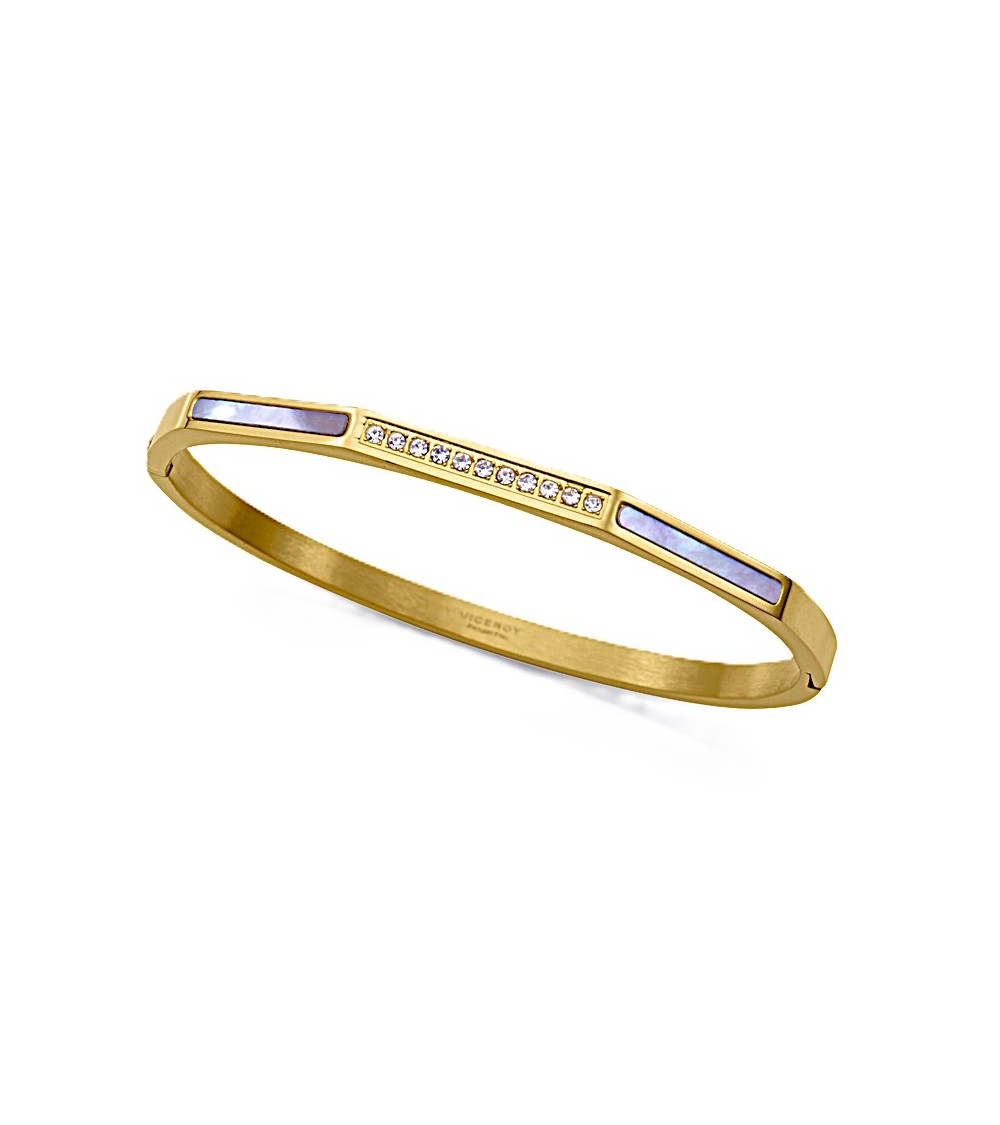 PULSERA RÍGIDA BRAZALETE DORADO ACERO CON CIRCONITAS Y NÁCAR BLANCO