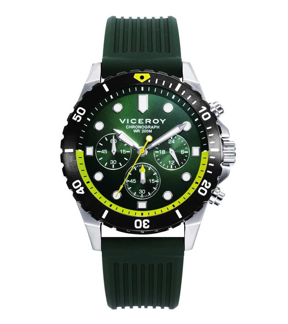 RELOJ DEPORTIVO DE HOMBRE CRONÓGRAFO CORREA DE CAUCHO VERDE CAJA ACERO.