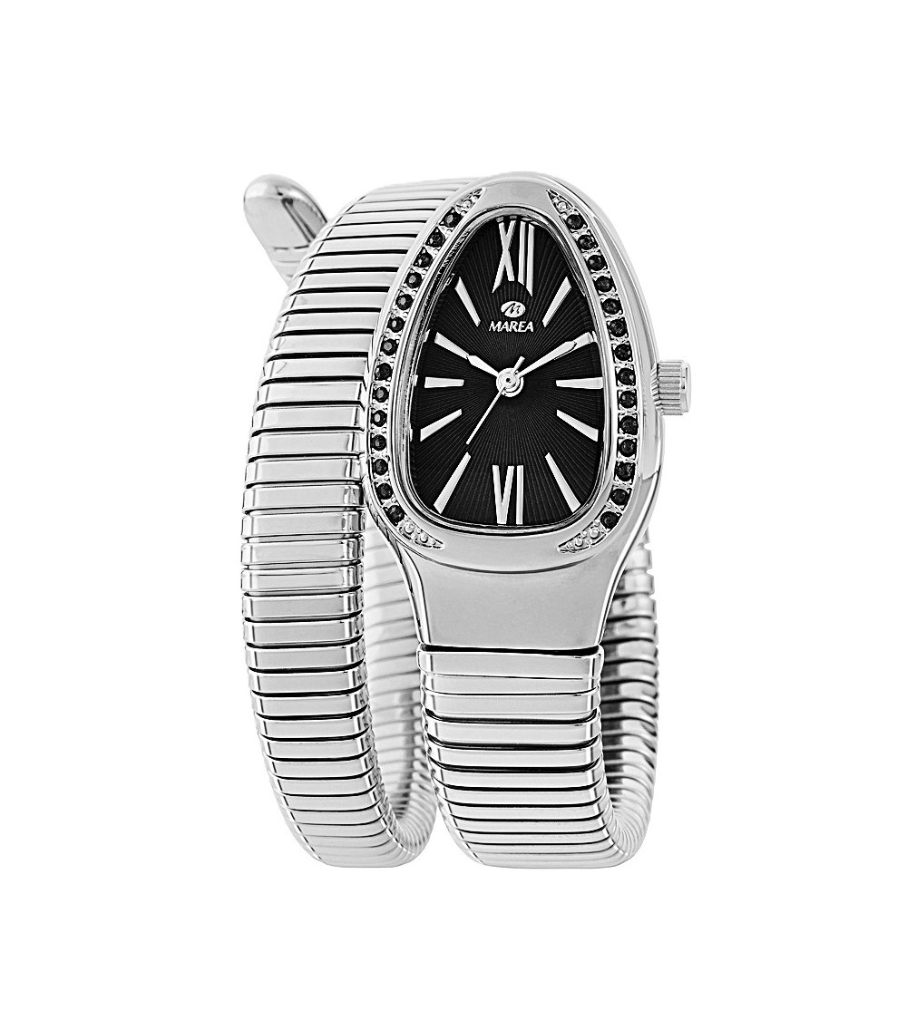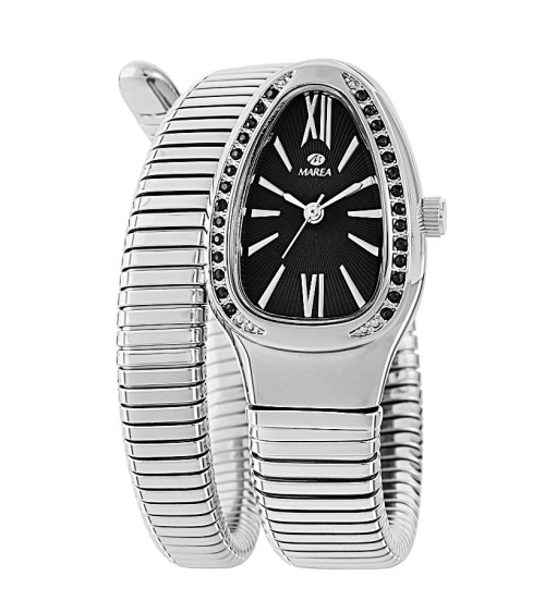 RELOJ JOYA ACERO PLATEADO CAJA OVAL FONDO NEGRO PULSERA EXTENSIBLE.