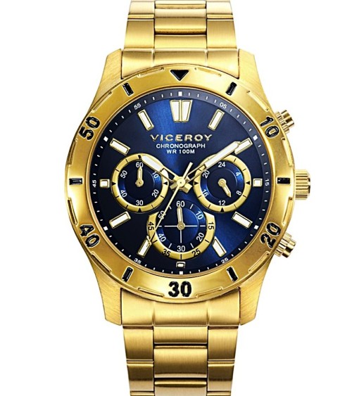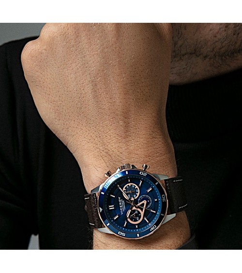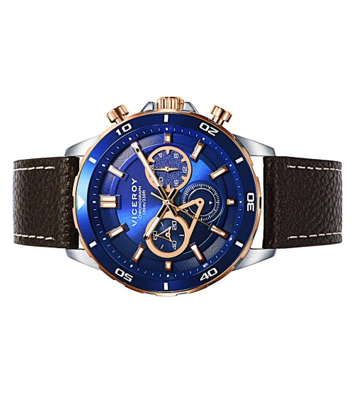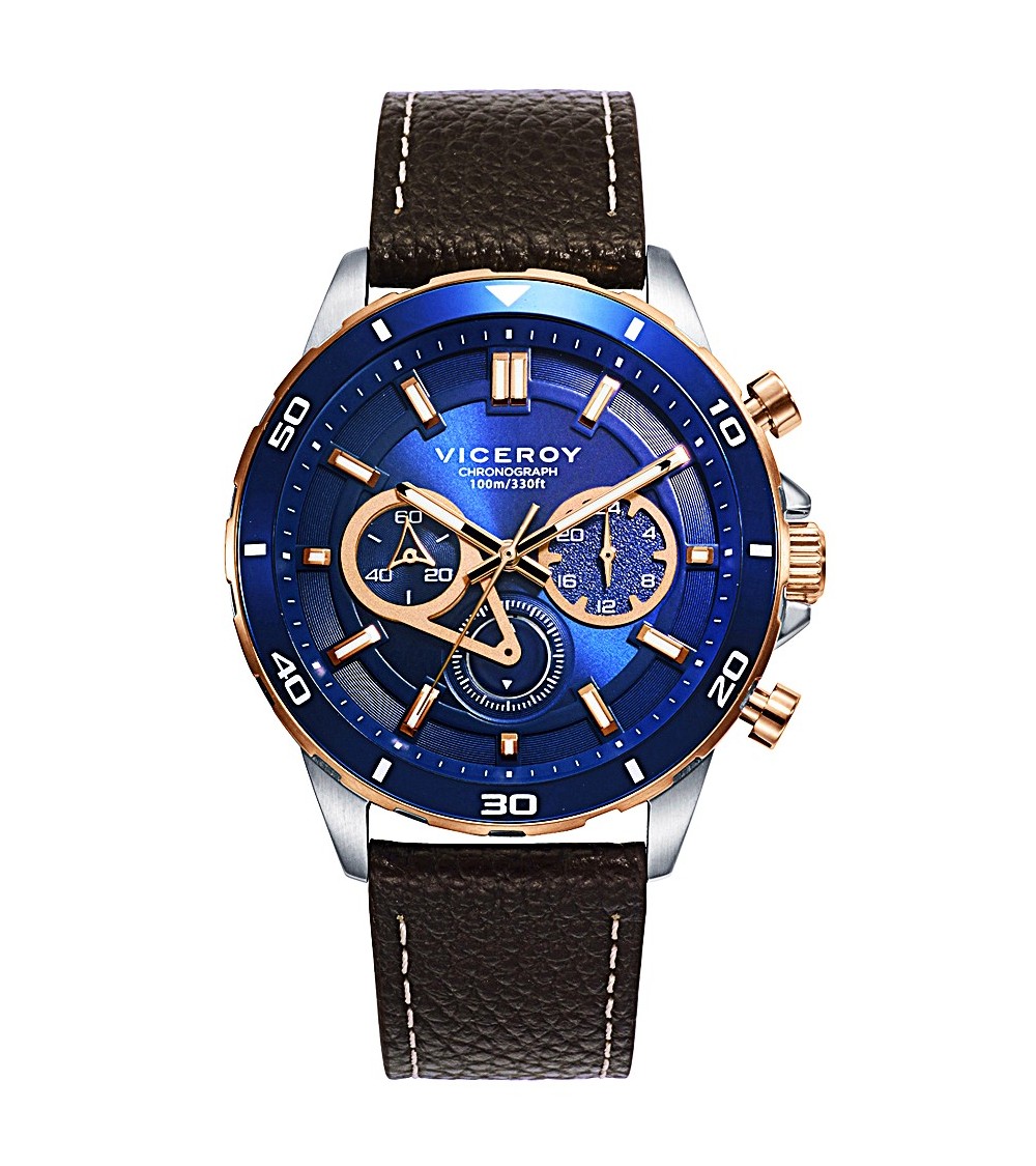 RELOJ DE HOMBRE CRONÓGRADO CORREA PIEL MARRÓN CAJA ACERO COMBINADO CON ALUMINIO COLOR AZUL